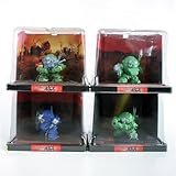 Four different Mechs from Armored Trooper Votoms series, also known as Scope Dog. Each figure comes in a 4 x 5 x 3" dome diorama, with a background and textured base. Figures themselves are about 2" in height. Each is packaged in a box with Japanese text packaging.